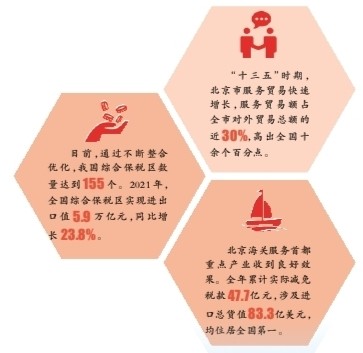 兩年多來(lái),北京“兩區(qū)”建設(shè)成效突出、亮點(diǎn)紛呈。作為創(chuàng)新示范者,北京海關(guān)助力天竺綜保區(qū)加快打造具有服務(wù)貿(mào)易特色的綜合保稅區(qū),為北京開放發(fā)展先行先試前沿政策,為我國(guó)海關(guān)特殊監(jiān)管區(qū)域創(chuàng)新發(fā)展探索經(jīng)驗(yàn)。2021年度,天竺綜保區(qū)進(jìn)出口值、營(yíng)業(yè)收入、屬地稅收分別同比增長(zhǎng)37.6%、25.1%、22.1%,其中藥品藥械、文化藝術(shù)品進(jìn)口規(guī)模分別占到全國(guó)總量的1/5、1/3。目前,園區(qū)形成了醫(yī)療健康、文化貿(mào)易、升級(jí)型消費(fèi)、航空服務(wù)等重點(diǎn)產(chǎn)業(yè)。