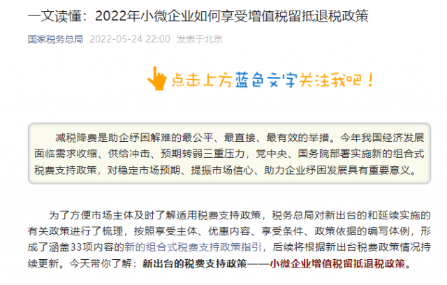 為了方便市場主體及時了解適用稅費支持政策,稅務(wù)總局對新出臺的和延續(xù)實施的有關(guān)政策進行了梳理,按照享受主體、優(yōu)惠內(nèi)容、享受條件、政策依據(jù)的編寫體例,形成了涵蓋33項內(nèi)容的新的組合式稅費支持政策指引,后續(xù)將根據(jù)新出臺稅費政策情況持續(xù)更新。今天帶你了解:新出臺的稅費支持政策——小微企業(yè)增值稅留抵退稅政策。