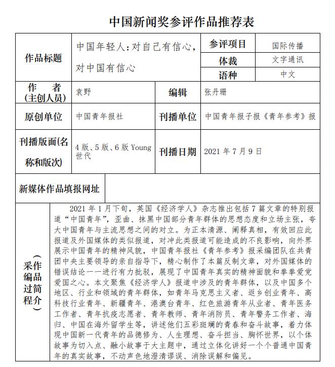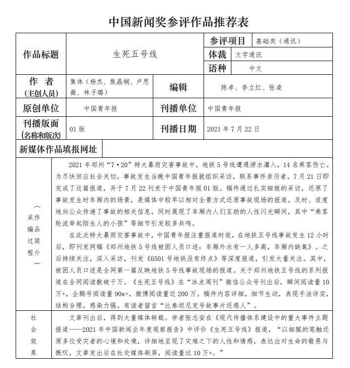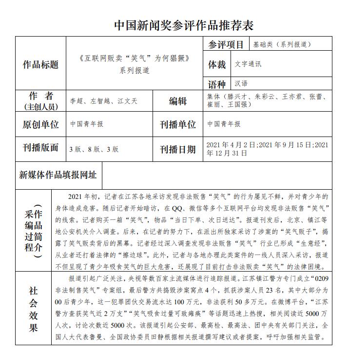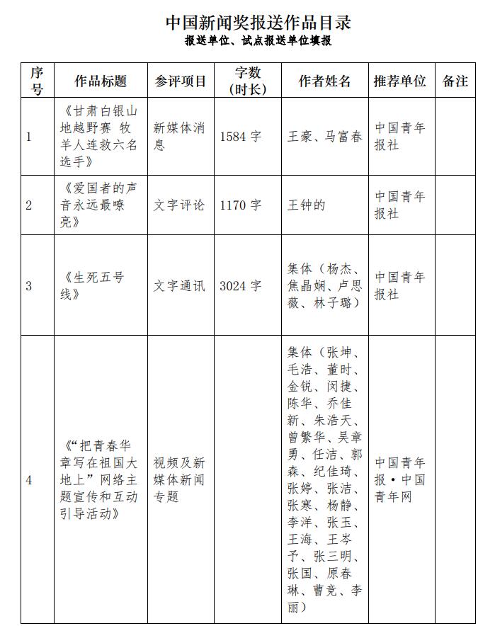 中國青年報社推薦參評第三十二屆中國新聞獎報送作品公示
