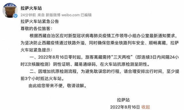 央視網(wǎng)消息:據(jù)@拉薩火車站 微博消息,根據(jù)西藏自治區(qū)應(yīng)對(duì)新型冠狀病毒肺炎疫情工作領(lǐng)導(dǎo)小組辦公室最新通知要求,為堅(jiān)決防止西藏疫情通過(guò)鐵路外溢,同時(shí)確保您乘坐鐵路列車安全、順暢離藏,拉薩火車站緊急提示:8月16日零時(shí)起,旅客離藏需持“三天兩檢”(即連續(xù)3日內(nèi)間隔24小時(shí)2次核酸檢測(cè))陰性證明、藏易通綠碼,在火車站抗原檢測(cè)呈陰性。因增加抗原檢測(cè)流程,請(qǐng)至少提前3個(gè)小時(shí)抵達(dá)火車站。