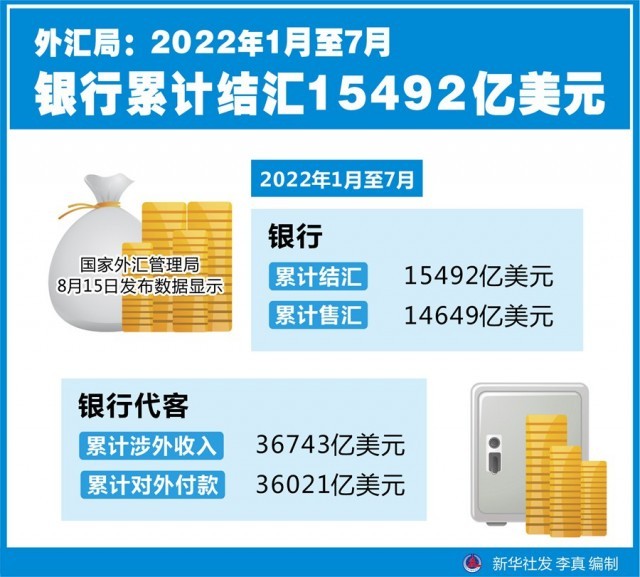 新華社北京8月15日電(記者劉開雄)國家外匯管理局15日發(fā)布數據顯示,今年1月至7月,銀行累計結匯15492億美元,累計售匯14649億美元;銀行代客累計涉外收入36743億美元,累計對外付款36021億美元。