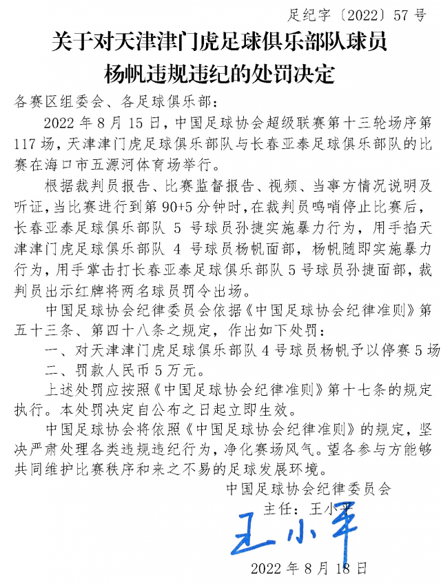 18日晚,中國(guó)足協(xié)網(wǎng)站發(fā)布4則球員、俱樂部官員違規(guī)違紀(jì)的處罰決定,中超天津津門虎球員楊帆、中超長(zhǎng)春亞泰球員孫捷及中乙青島紅獅球員王建文均停賽5場(chǎng),中甲遼寧沈陽(yáng)城市足球俱樂部官員林濤6場(chǎng)比賽禁止進(jìn)入體育場(chǎng)。處罰決定全文如下: