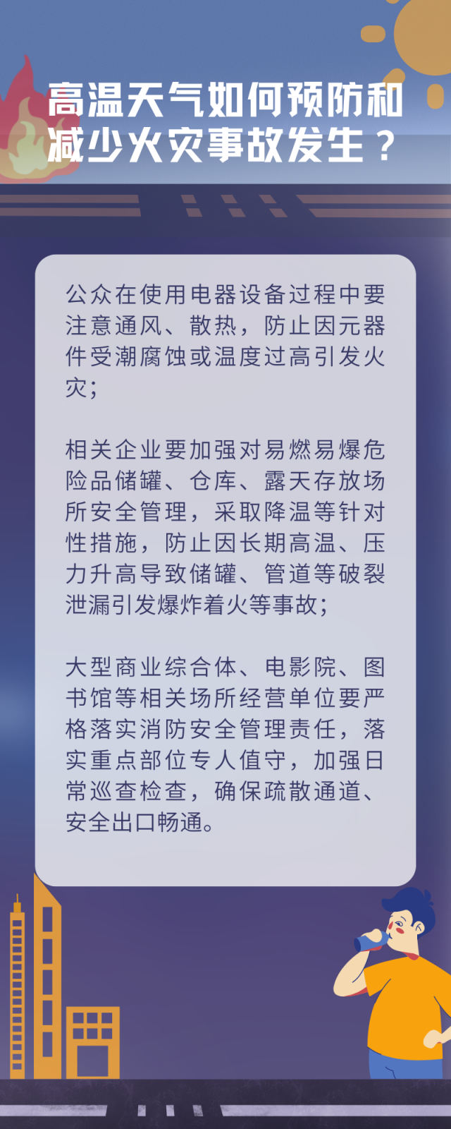 高溫天氣如何有效預(yù)防和減少火災(zāi)事故發(fā)生?應(yīng)急管理部消防救援局發(fā)布消防安全提示,公眾在使用電器設(shè)備過程中要注意通風(fēng)、散熱,防止因元器件受潮腐蝕或溫度過高引發(fā)火災(zāi);相關(guān)企業(yè)要加強(qiáng)對(duì)易燃易爆危險(xiǎn)品儲(chǔ)罐、倉庫、露天存放場(chǎng)所安全管理,采取降溫等針對(duì)性措施,防止因長(zhǎng)期高溫、壓力升高導(dǎo)致儲(chǔ)罐、管道等破裂泄漏引發(fā)爆炸著火等事故;大型商業(yè)綜合體、電影院、圖書館等相關(guān)場(chǎng)所經(jīng)營(yíng)單位要嚴(yán)格落實(shí)消防安全管理責(zé)任,落實(shí)重點(diǎn)部位專人值守,加強(qiáng)日常巡查檢查,確保疏散通道、安全出口暢通。