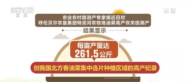 央視網(wǎng)消息:記者從內(nèi)蒙古自治區(qū)農(nóng)牧廳獲悉,農(nóng)業(yè)農(nóng)村部測產(chǎn)專家組近日對呼倫貝爾農(nóng)墾集團(tuán)特泥河農(nóng)牧場油菜高產(chǎn)攻關(guān)田測產(chǎn)的結(jié)果顯示,每畝產(chǎn)量達(dá)261.5公斤,創(chuàng)我國北方春油菜集中連片種植區(qū)域的高產(chǎn)紀(jì)錄。
