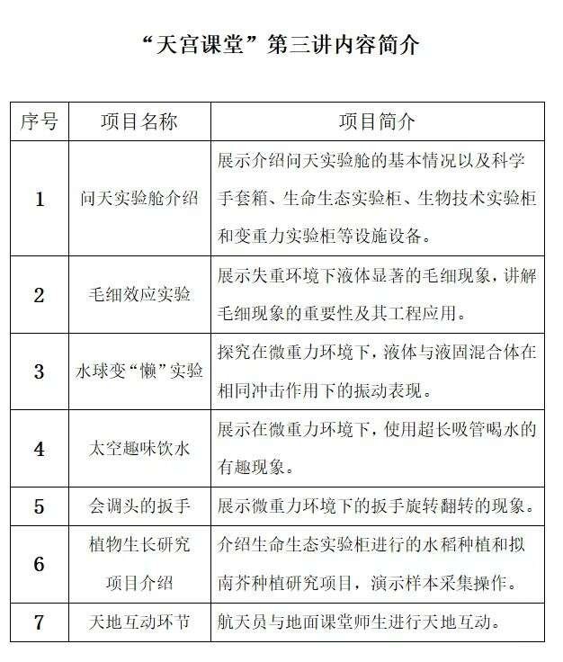 此次太空授課活動將繼續(xù)采取天地互動方式進(jìn)行,3名航天員將在軌介紹展示中國空間站問天實驗艙工作生活場景,演示微重力環(huán)境下毛細(xì)效應(yīng)實驗、水球變“懶”實驗、太空趣味飲水、會調(diào)頭的扳手以及植物生長研究項目介紹,并與地面課堂進(jìn)行互動交流,旨在傳播普及載人航天知識,激發(fā)廣大青少年對科學(xué)的興趣。