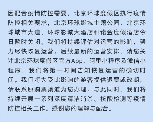 據(jù)@北京環(huán)球度假區(qū) 微博消息,因配合疫情防控需要,北京環(huán)球度假區(qū)執(zhí)行疫情防控相關(guān)要求,北京環(huán)球影城主題公園、北京環(huán)球城市大道、環(huán)球影城大酒店和諾金度假酒店今日暫時(shí)關(guān)閉。我們將持續(xù)評(píng)估對(duì)運(yùn)營(yíng)的影響,努力盡快恢復(fù)運(yùn)營(yíng)。后續(xù)最新的運(yùn)營(yíng)安排,請(qǐng)您關(guān)注北京環(huán)球度假區(qū)官方App、阿里小程序及微信小程序,我們將第一時(shí)間告知恢復(fù)運(yùn)營(yíng)的確切時(shí)間。我們將為受此影響的游客提供退票或改期,請(qǐng)聯(lián)系原購(gòu)票渠道為您辦理。與此同時(shí),我們將持續(xù)開展一系列深度清潔消殺、核酸檢測(cè)等疫情防控相關(guān)工作。感謝您的理解與配合。