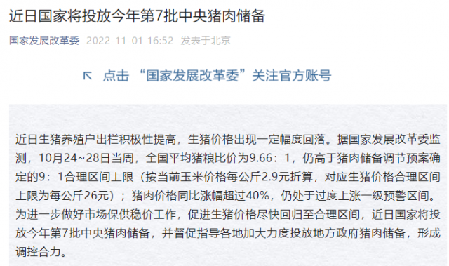國家發(fā)展改革委:近日國家將投放今年第7批中央豬肉儲備