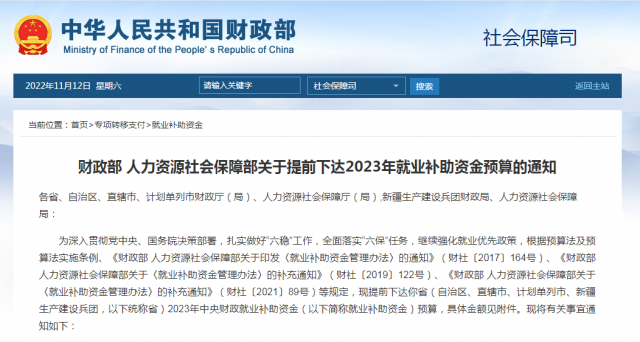 財政部、人社部10日發(fā)布《關(guān)于提前下達(dá)2023年就業(yè)補助資金預(yù)算的通知》,提前下達(dá)資金達(dá)432.3億元。