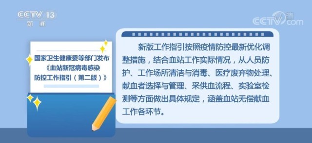 央視網(wǎng)消息:為落實(shí)進(jìn)一步優(yōu)化新冠肺炎疫情防控措施相關(guān)要求,指導(dǎo)采供血機(jī)構(gòu)科學(xué)有效做好無償獻(xiàn)血工作,國(guó)家衛(wèi)生健康委辦公廳、中央軍委后勤保障部衛(wèi)生局組織專家對(duì)2021年印發(fā)的《血站新冠肺炎疫情常態(tài)化防控工作指引》進(jìn)行修訂,形成《血站新冠病毒感染防控工作指引(第二版)》,指導(dǎo)采供血機(jī)構(gòu)切實(shí)做好新形勢(shì)下疫情防控工作,保障血站工作人員和獻(xiàn)血者安全,實(shí)現(xiàn)血液安全供應(yīng)。
