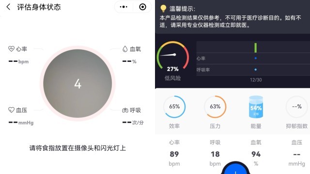 記者在某個(gè)小程序?qū)崪y血氧,將食指輕放在手機(jī)的攝像頭和閃光燈上,90秒即可測得血氧、心率等指標(biāo),但頁面提示監(jiān)測結(jié)果僅供參考,不可用于醫(yī)療診斷目的。
