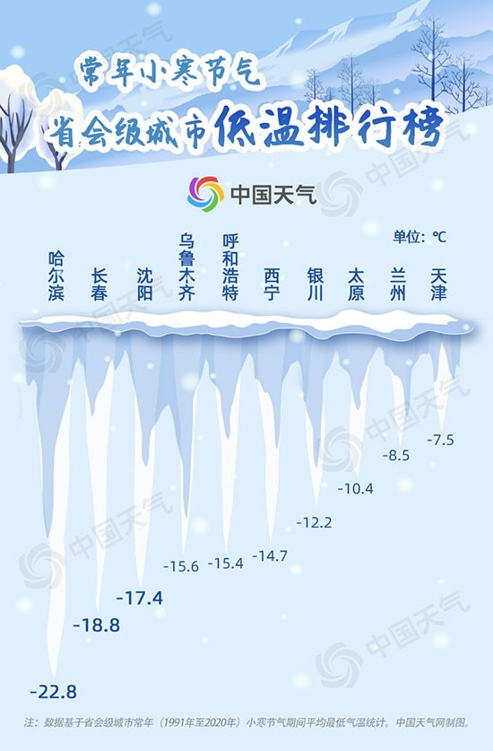 從中國天氣網(wǎng)1991-2020年小寒節(jié)氣省會(huì)級(jí)城市低溫排行榜可以看出,上榜的均為北方城市,其中哈爾濱以-22.8℃位列榜首,長(zhǎng)春和沈陽分別位居第二、第三。