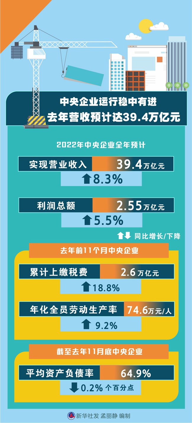 新華社北京1月5日電(記者王希)2022年,國資央企統(tǒng)籌疫情防控和企業(yè)生產(chǎn)經(jīng)營,統(tǒng)籌發(fā)展和安全,推動(dòng)經(jīng)濟(jì)運(yùn)行實(shí)現(xiàn)穩(wěn)中有進(jìn),中央企業(yè)全年預(yù)計(jì)實(shí)現(xiàn)營業(yè)收入39.4萬億元、利潤總額2.55萬億元,同比分別增長8.3%和5.5%。