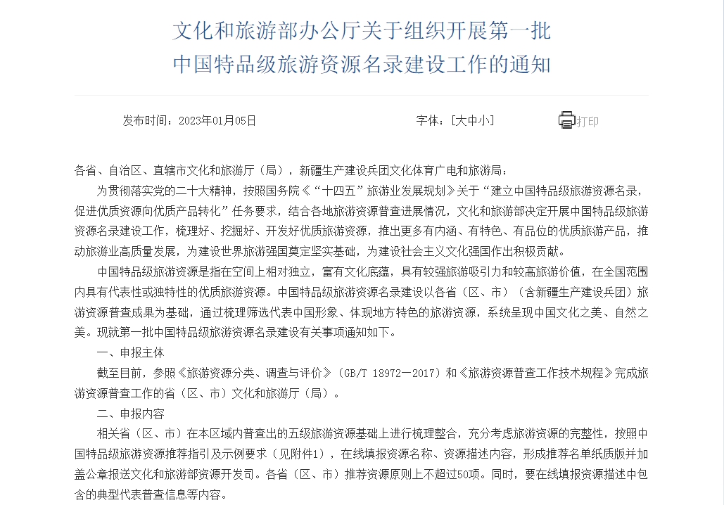 文旅部:開展第一批中國特品級(jí)旅游資源名錄建設(shè)工作
