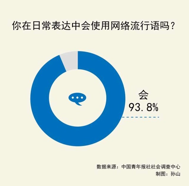 數(shù)據(jù)顯示,93.8%的受訪青年會在日常表達中使用網(wǎng)絡(luò)流行語,90后的比例更高(95.9%)。
