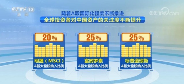 隨著A股國際化程度不斷推進,全球投資者對中國資產(chǎn)的關(guān)注度不斷提升。明晟(MSCI)、富時羅素和標普道瓊斯的A股大盤股納入比例已分別達到20%、25%和25%。