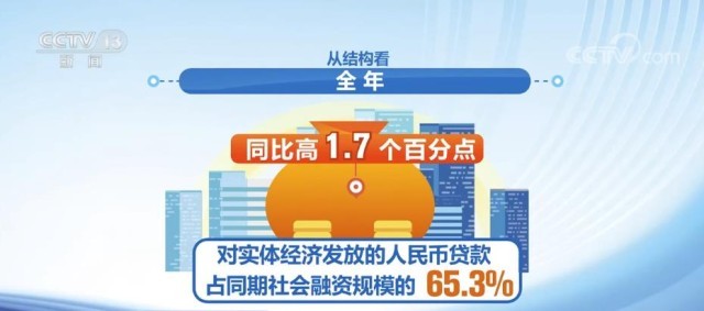 從結(jié)構(gòu)看,全年對實體經(jīng)濟發(fā)放的人民幣貸款占同期社會融資規(guī)模的65.3%,同比高1.7個百分點。