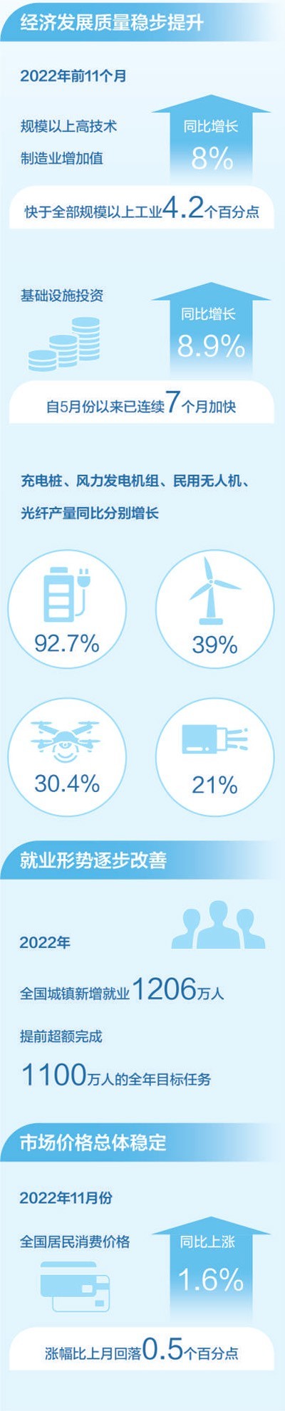 2022年,面對風(fēng)高浪急的國際環(huán)境和艱巨繁重的國內(nèi)改革發(fā)展穩(wěn)定任務(wù),我國經(jīng)濟(jì)穩(wěn)健發(fā)展,全年國內(nèi)生產(chǎn)總值預(yù)計超過120萬億元。看供給結(jié)構(gòu),產(chǎn)業(yè)升級發(fā)展持續(xù),新動能積蓄增強。2022年前11個月,規(guī)模以上高技術(shù)制造業(yè)增加值同比增長8%,快于全部規(guī)模以上工業(yè)4.2個百分點;看消費需求,線上消費需求釋放帶動作用明顯。前11個月,全國實物商品網(wǎng)上零售額同比增長6.4%,網(wǎng)絡(luò)購物帶動快遞等行業(yè)較快增長。