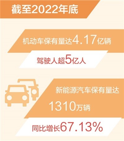 本報(bào)北京1月11日電 (記者張?zhí)炫啵┕膊?1日發(fā)布統(tǒng)計(jì)顯示,2022年全國(guó)機(jī)動(dòng)車(chē)保有量達(dá)4.17億輛,其中汽車(chē)3.19億輛;全國(guó)機(jī)動(dòng)車(chē)駕駛?cè)诉_(dá)5.02億人,其中汽車(chē)駕駛?cè)?.64億人。2022年全國(guó)新注冊(cè)登記機(jī)動(dòng)車(chē)3478萬(wàn)輛,新領(lǐng)證駕駛?cè)?923萬(wàn)人。
