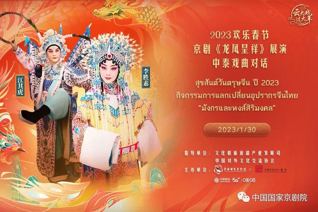 中新網(wǎng)北京1月31日電 據(jù)國(guó)家京劇院消息,1月30日,濃濃的年味還未散盡,國(guó)家京劇院一團(tuán)團(tuán)長(zhǎng)、一級(jí)演員李勝素,一級(jí)演員江其虎等,攜經(jīng)典大戲《龍鳳呈祥》演播參加曼谷中國(guó)文化中心歡樂(lè)春節(jié)系列活動(dòng)之一——“京劇《龍鳳呈祥》演播·中泰戲曲對(duì)話”活動(dòng)。劇院藝術(shù)家與泰國(guó)觀眾“云端”相見(jiàn),京劇《龍鳳呈祥》以線上演播的形式,與泰國(guó)優(yōu)泰劇展開(kāi)對(duì)話,共慶喜慶祥和的傳統(tǒng)佳節(jié)。中國(guó)駐泰國(guó)大使館臨時(shí)代辦楊欣專門(mén)以視頻形式致辭,泰國(guó)文化部副常秘玉提佳女士出席活動(dòng)并代表泰國(guó)文化部致辭,曼谷中國(guó)文化中心兼駐曼谷旅游辦主任闕小華、曼谷中國(guó)文化中心副主任趙歆等近200位各界人士現(xiàn)場(chǎng)參與了活動(dòng)。