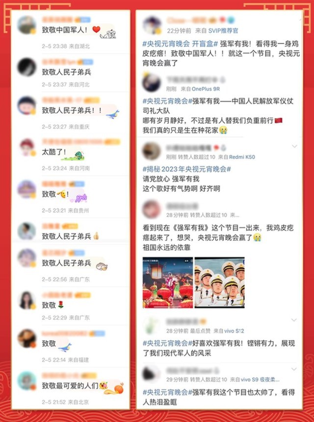 “請(qǐng)黨放心,強(qiáng)軍有我”“清澈的愛,獻(xiàn)給我的祖國(guó)”……聲聲誓言、字字鏗鏘。首次參加總臺(tái)元宵晚會(huì)的中國(guó)人民解放軍儀仗司禮大隊(duì)奏唱的歌曲《強(qiáng)軍有我》,不僅唱出中國(guó)軍人的拳拳赤子心,更唱出了“最可愛的人”那豪邁激情和磅礴氣勢(shì)。整齊劃一的動(dòng)作、堅(jiān)定有力的眼神讓無(wú)數(shù)網(wǎng)友直呼:“震撼!這就是中國(guó)排面”“為人民子弟兵熱淚盈眶”“致敬中國(guó)軍人!感謝你們?yōu)榇蠹邑?fù)重前行”。而網(wǎng)友們也用整齊一致的留言共同致敬“最可愛的人”。