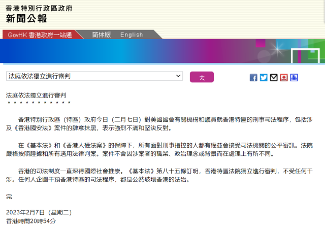 香港特區(qū)政府:堅決反對美國會有關(guān)機構(gòu)及議員抹黑香港刑事司法程序