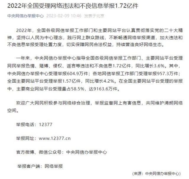 2022年全國受理網(wǎng)絡(luò)違法和不良信息舉報1.72億件
