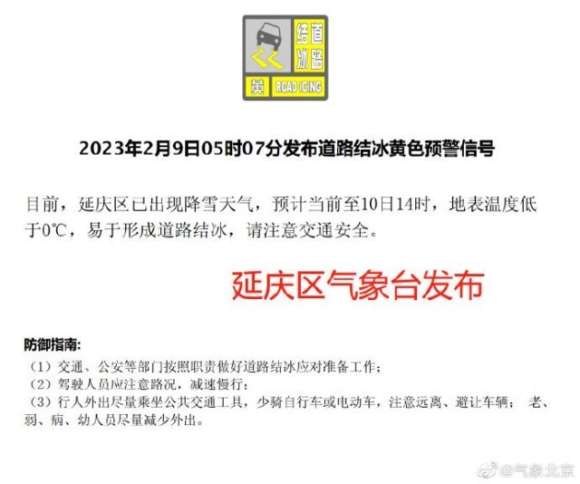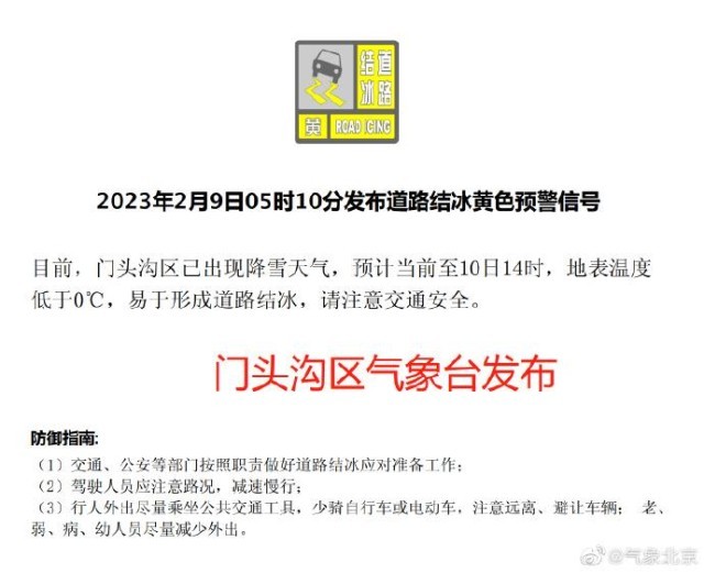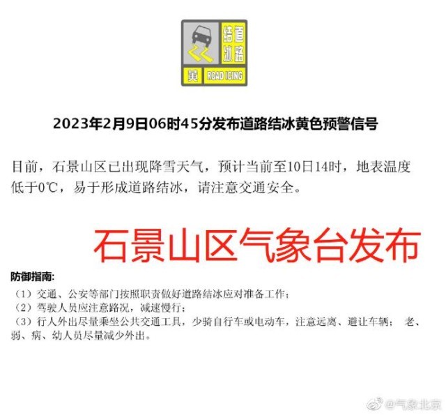 另外,目前石景山、門頭溝、延慶區(qū)氣象臺已發(fā)布道路結(jié)冰黃色預警信號,上述區(qū)域已出現(xiàn)降雪,易形成道路結(jié)冰,請大家出行注意交通安全。