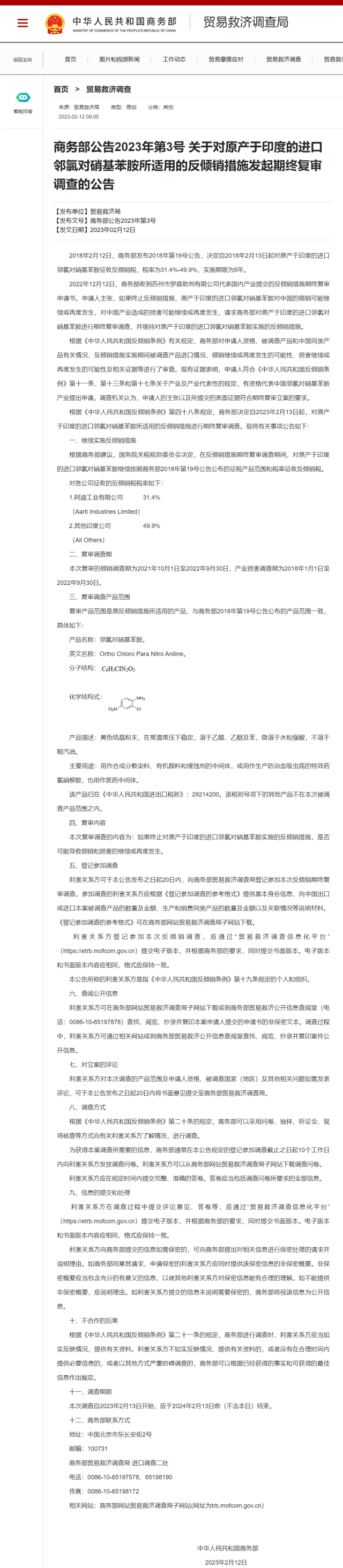 央視網(wǎng)消息:2月12日,商務(wù)部網(wǎng)站發(fā)布公告,決定自2023年2月13日起,對原產(chǎn)于印度的進(jìn)口鄰氯對硝基苯胺所適用的反傾銷措施進(jìn)行期終復(fù)審調(diào)查。根據(jù)商務(wù)部建議,國務(wù)院關(guān)稅稅則委員會決定,在反傾銷措施期終復(fù)審調(diào)查期間,對原產(chǎn)于印度的進(jìn)口鄰氯對硝基苯胺繼續(xù)按照商務(wù)部2018年第19號公告公布的征稅產(chǎn)品范圍和稅率征收反傾銷稅。