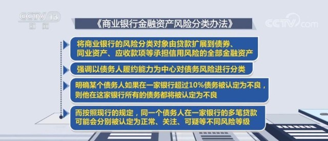 央視網(wǎng)消息:銀保監(jiān)會(huì)、中國(guó)人民銀行制定《商業(yè)銀行金融資產(chǎn)風(fēng)險(xiǎn)分類(lèi)辦法》,于2月11日正式對(duì)外發(fā)布。推動(dòng)商業(yè)銀行加強(qiáng)信用風(fēng)險(xiǎn)管理、提升服務(wù)實(shí)體經(jīng)濟(jì)水平。