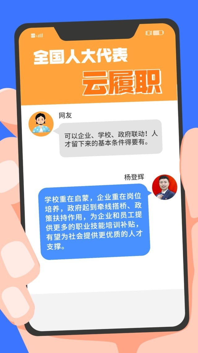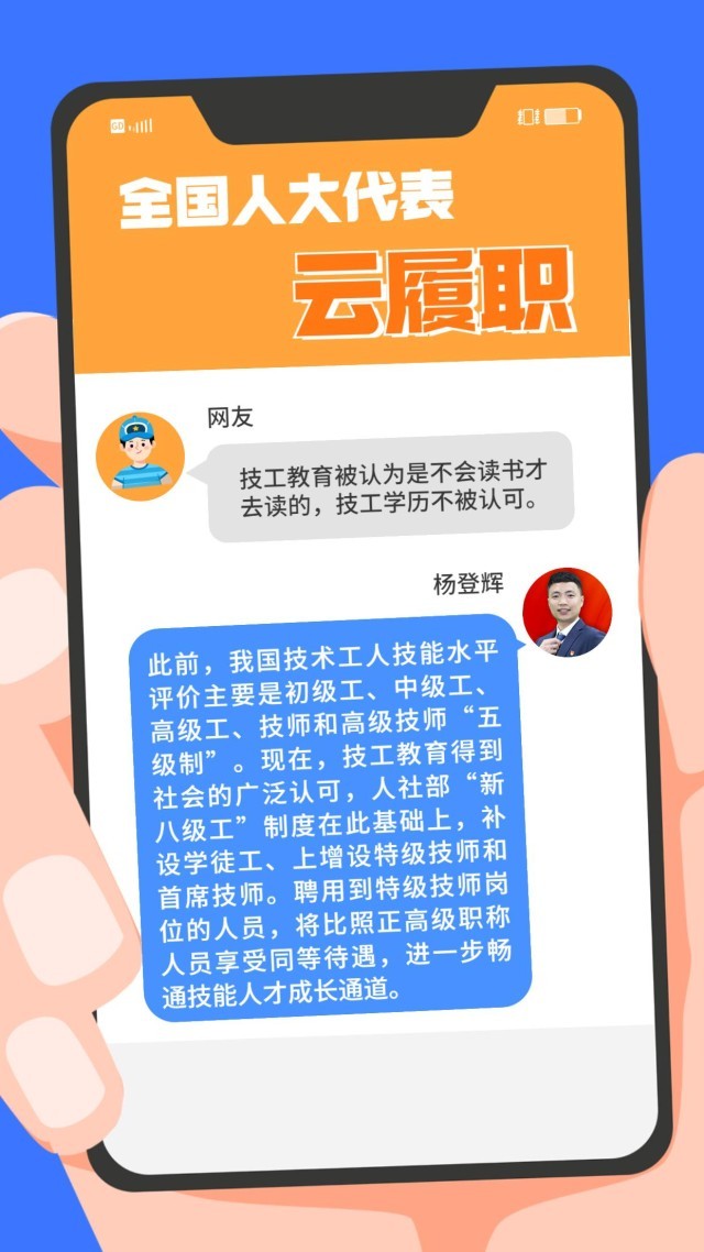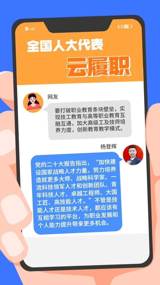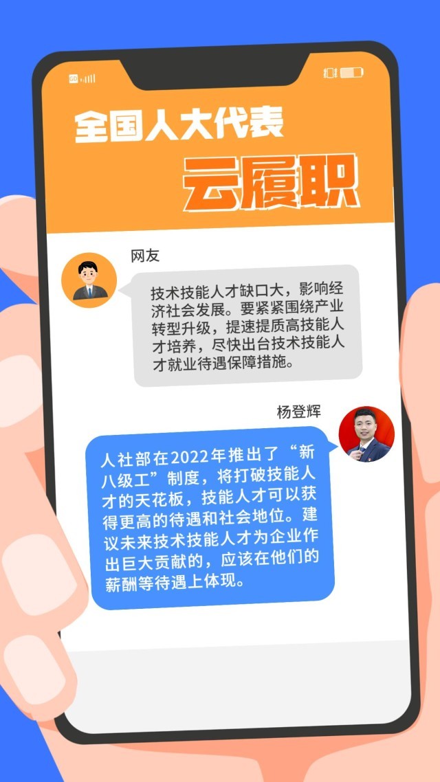現(xiàn)實中,“技能人才短缺”現(xiàn)象頻頻出現(xiàn)。針對技能人才的供給與產(chǎn)業(yè)發(fā)展的實際需求在規(guī)模、結(jié)構(gòu)和質(zhì)量上不對稱、不適應等問題,全國人大代表、第44屆世界技能大賽冠軍楊登輝在赴京履職前,通過線上方式征求網(wǎng)友的意見。對部分有代表性的留言,楊登輝一一作了回復。來看看這位95后全國人大代表怎么說↓↓↓