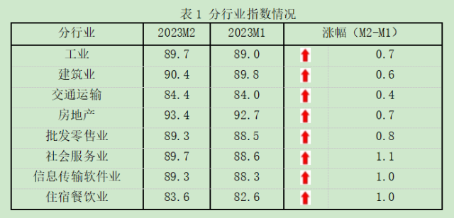 2月份,隨著經(jīng)濟(jì)逐步恢復(fù),8個行業(yè)指數(shù)均連續(xù)兩個月上升。服務(wù)業(yè)指數(shù)恢復(fù)速度領(lǐng)先,其中,社會服務(wù)業(yè)、信息傳輸計(jì)算機(jī)服務(wù)軟件業(yè)、住宿餐飲業(yè)和批發(fā)零售業(yè)指數(shù)分別上升1.1、1.0、1.0和0.8點(diǎn)。