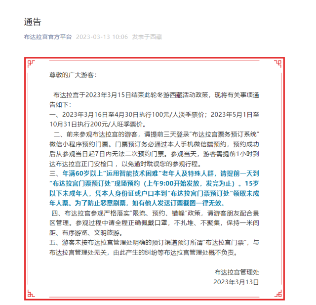 央視網(wǎng)消息:據(jù)布達(dá)拉宮官方平臺微信公眾號消息,布達(dá)拉宮于2023年3月15日結(jié)束此輪冬游西藏活動政策,現(xiàn)將有關(guān)事項通告如下: