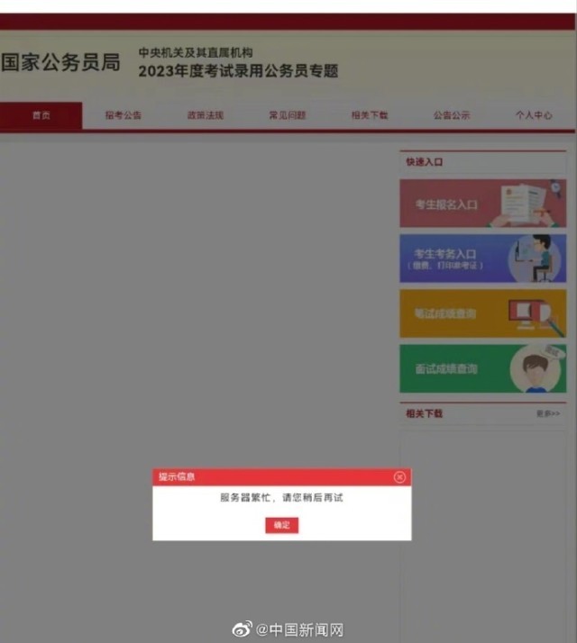 另據(jù)中新網(wǎng)報道,14日晚間,不少考生在網(wǎng)站曬出剛剛查到的2023國考筆試成績。一些網(wǎng)友反映2023國考專題網(wǎng)頁上分?jǐn)?shù)查詢通道擁擠,網(wǎng)頁顯示“服務(wù)器繁忙”。