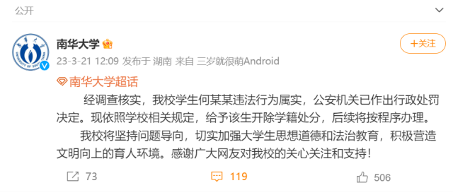 央視網(wǎng)消息:據(jù)@南華大學(xué) 微博最新消息,經(jīng)調(diào)查核實,該校學(xué)生何某某違法行為屬實,公安機(jī)關(guān)已作出行政處罰決定?,F(xiàn)依照學(xué)校相關(guān)規(guī)定,給予該生開除學(xué)籍處分,后續(xù)將按程序辦理。