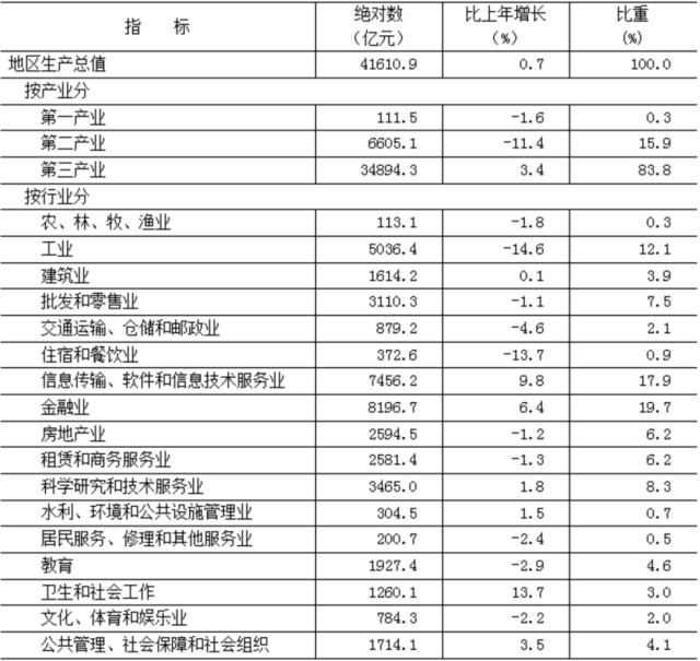 初步核算,全年實(shí)現(xiàn)地區(qū)生產(chǎn)總值41610.9億元,按不變價格計算,比上年增長0.7%。其中,第一產(chǎn)業(yè)[2]增加值111.5億元,下降1.6%;第二產(chǎn)業(yè)增加值6605.1億元,下降11.4%;第三產(chǎn)業(yè)增加值34894.3億元,增長3.4%。三次產(chǎn)業(yè)構(gòu)成為0.3︰15.9︰83.8。按常住人口計算,全市人均地區(qū)生產(chǎn)總值為19.0萬元。