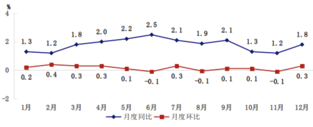 全年居民消費(fèi)價格總水平比上年上漲1.8%。工業(yè)生產(chǎn)者出廠價格上漲2.3%,工業(yè)生產(chǎn)者購進(jìn)價格上漲6.2%。農(nóng)產(chǎn)品生產(chǎn)者價格上漲2.7%。12月份,新建商品住宅銷售價格環(huán)比指數(shù)為100.2、同比指數(shù)為105.8;二手住宅銷售價格環(huán)比指數(shù)為99.6、同比指數(shù)為103.9。