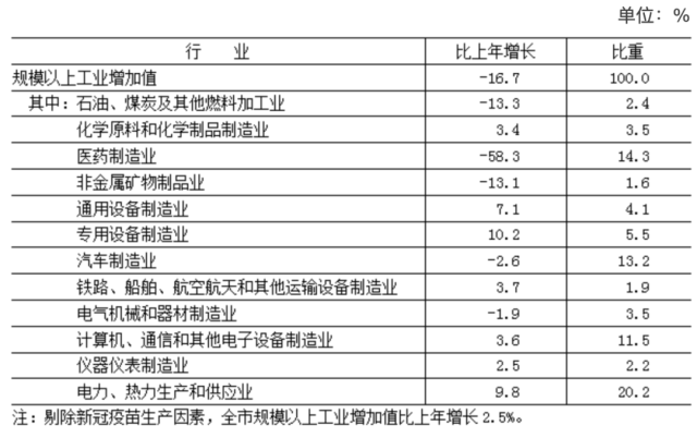 全年實(shí)現(xiàn)工業(yè)增加值5036.4億元,按不變價格計算,比上年下降14.6%。其中,規(guī)模以上工業(yè)[4]增加值下降16.7%,剔除新冠疫苗生產(chǎn)因素增長2.5%。在規(guī)模以上工業(yè)中,電力、熱力生產(chǎn)和供應(yīng)業(yè)增長9.8%,計算機(jī)、通信和其他電子設(shè)備制造業(yè)增長3.6%,汽車制造業(yè)下降2.6%,醫(yī)藥制造業(yè)下降58.3%(剔除新冠疫苗生產(chǎn)因素后增長6.4%)。規(guī)模以上工業(yè)實(shí)現(xiàn)銷售產(chǎn)值22366.3億元,下降5.7%。其中,內(nèi)銷產(chǎn)值20560.5億元,下降1.8%;出口交貨值1805.8億元,下降35.0%。