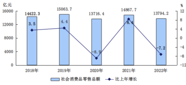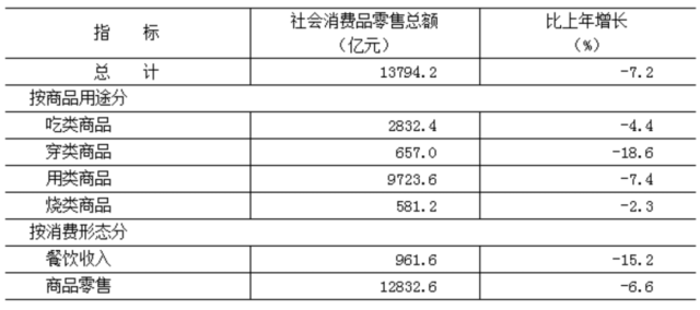 全年市場總消費(fèi)額比上年下降4.9%。其中,服務(wù)性消費(fèi)額下降2.9%;實(shí)現(xiàn)社會消費(fèi)品零售總額13794.2億元,下降7.2%。