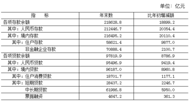 年末全市金融機(jī)構(gòu)(含外資)本外幣存款余額218628.8億元,比年初增加18899.2億元。全市金融機(jī)構(gòu)(含外資)本外幣貸款余額97819.9億元,比年初增加8786.9億元。