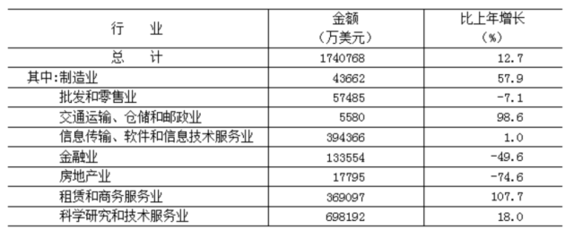 全年實(shí)際利用外商直接投資174.1億美元,按可比口徑[8]計算,比上年增長12.7%。其中,科學(xué)研究和技術(shù)服務(wù)業(yè)69.8億美元,占40.1%,增長18.0%;信息傳輸、軟件和信息技術(shù)服務(wù)業(yè)39.4億美元,占22.7%,增長1.0%;租賃和商務(wù)服務(wù)業(yè)36.9億美元,占21.2%,增長1.1倍。