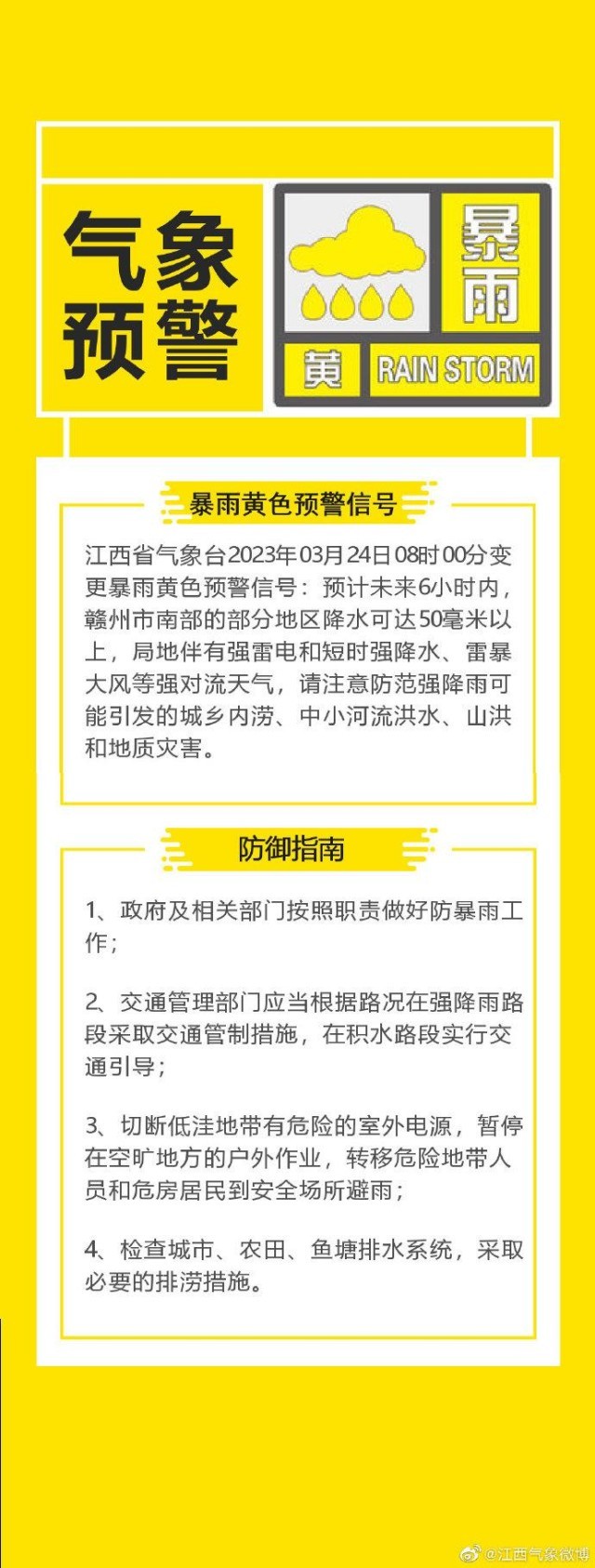 江西省氣象臺(tái)2023年03月24日08時(shí)00分變更暴雨黃色預(yù)警信號(hào):預(yù)計(jì)未來6小時(shí)內(nèi),贛州市南部的部分地區(qū)降水可達(dá)50毫米以上,局地伴有強(qiáng)雷電和短時(shí)強(qiáng)降水、雷暴大風(fēng)等強(qiáng)對(duì)流天氣,請注意防范強(qiáng)降雨可能引發(fā)的城鄉(xiāng)內(nèi)澇、中小河流洪水、山洪和地質(zhì)災(zāi)害。