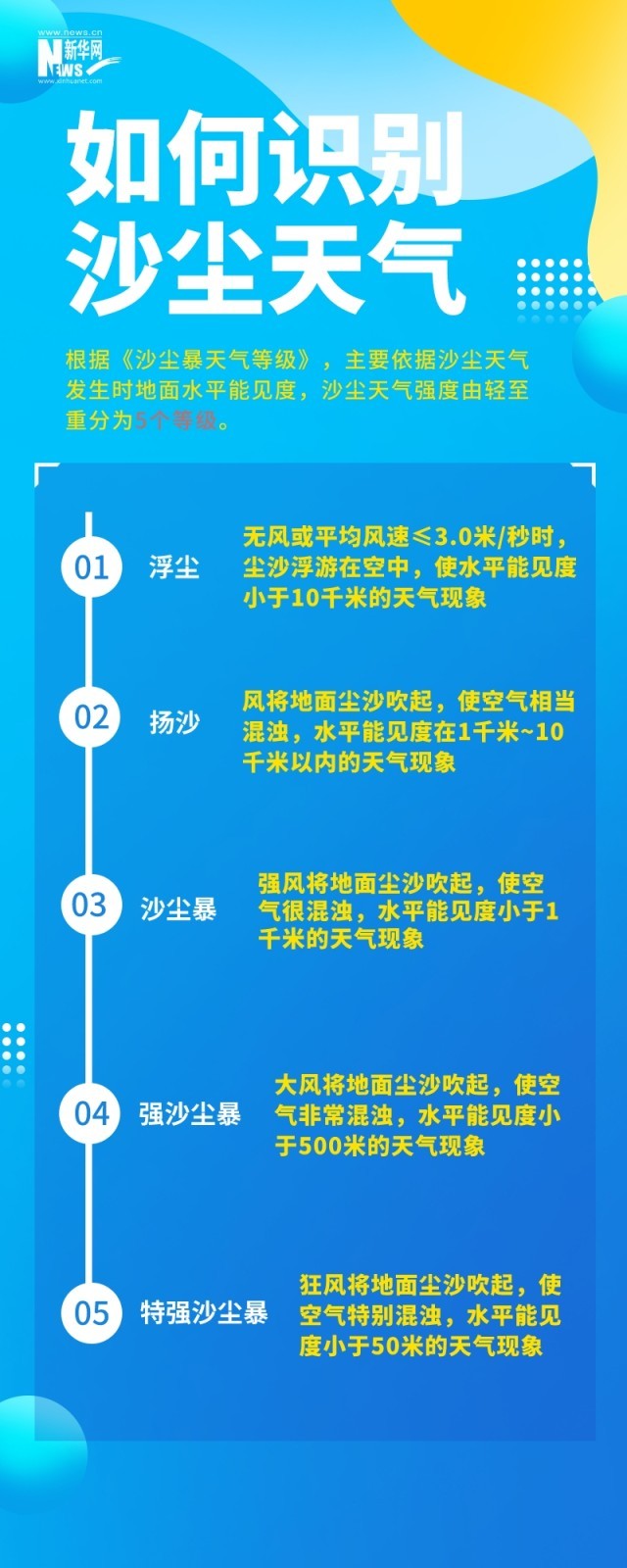 沙塵天氣是指風(fēng)將地面塵土、沙粒卷入空中,使空氣混濁的天氣現(xiàn)象。根據(jù)《沙塵暴天氣等級(jí)》,主要依據(jù)沙塵天氣發(fā)生時(shí)地面水平能見度,沙塵天氣強(qiáng)度由輕至重分為5個(gè)等級(jí)。