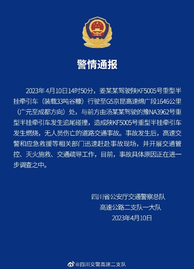 央視網(wǎng)消息:據(jù)@四川交警高速二支隊(duì)微博通報(bào),4月10日14時(shí)50分,姜某某駕駛陜KF5005號(hào)重型半掛牽引車(裝載33噸谷糠)行駛至G5京昆高速綿廣段1646公里(廣元至成都方向)處,與前方由湯某某駕駛的豫NA3962號(hào)重型半掛牽引車發(fā)生追尾碰撞,造成陜KF5005號(hào)重型半掛牽引車發(fā)生燃燒,無人員傷亡的道路交通事故。事故發(fā)生后,高速交警和應(yīng)急救援等相關(guān)部門迅速趕赴事故現(xiàn)場(chǎng),并開展交通管控、滅火施救、交通疏導(dǎo)工作,目前,事故具體原因正在進(jìn)一步調(diào)查之中。