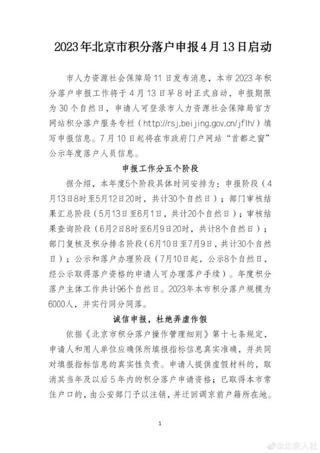 央視網(wǎng)消息:據(jù)@北京人社 微博消息,2023年北京市積分落戶申報(bào)工作將于4月13日早8時(shí)正式啟動(dòng)。