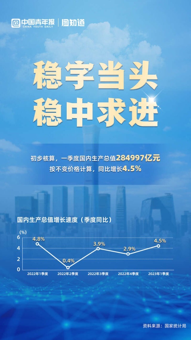 4月18日上午,國家統(tǒng)計局新聞發(fā)言人、國民經(jīng)濟綜合統(tǒng)計司司長付凌暉在介紹2023年一季度國民經(jīng)濟運行情況時說,初步核算,一季度國內(nèi)生產(chǎn)總值284997億元,按不變價格計算,同比增長4.5%。一季度,面對嚴峻復(fù)雜的國際環(huán)境和艱巨繁重的國內(nèi)改革發(fā)展穩(wěn)定任務(wù),我國走出穩(wěn)字當頭、穩(wěn)中求進的經(jīng)濟運行開局態(tài)勢。