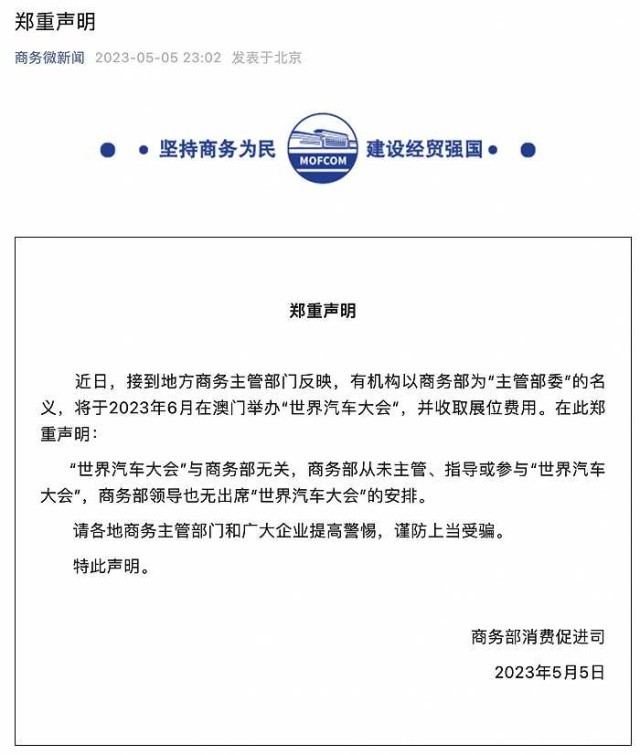 商務(wù)部聲明:從未主管、指導(dǎo)或參與“世界汽車(chē)大會(huì)”