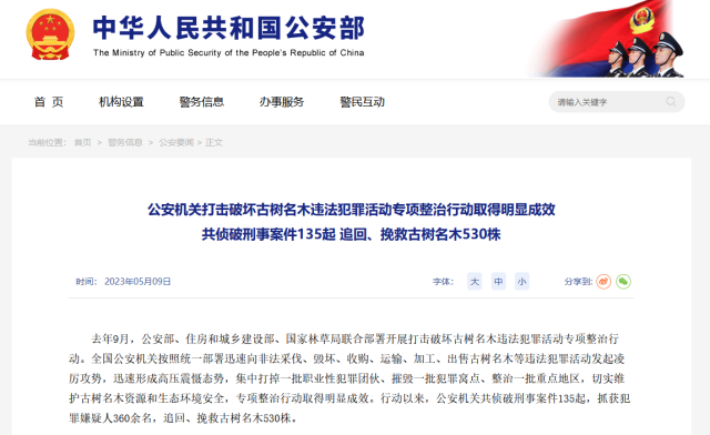 公安機關(guān)打擊破壞古樹名木違法犯罪活動專項整治行動取得明顯成效 追回、挽救古樹名木530株