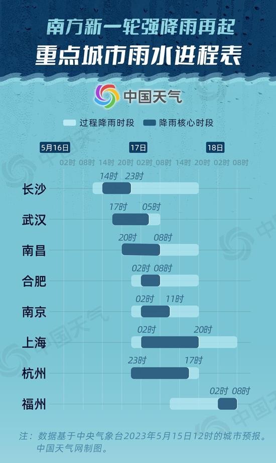 從中國天氣網(wǎng)推出的重點城市雨水進程表可以看出,長沙、武漢的降雨從明天白天就會陸續(xù)展開,降雨核心時段出現(xiàn)在明天下午到晚上。南昌、合肥、南京、上海和杭州的降雨都會在明天晚上開始,其中南昌的降雨核心時段集中在明天晚上,合肥、南京、上海和杭州集中在后天白天。福州由于處在最東邊,因此降雨核心時段最晚,主要集中在18日上午。