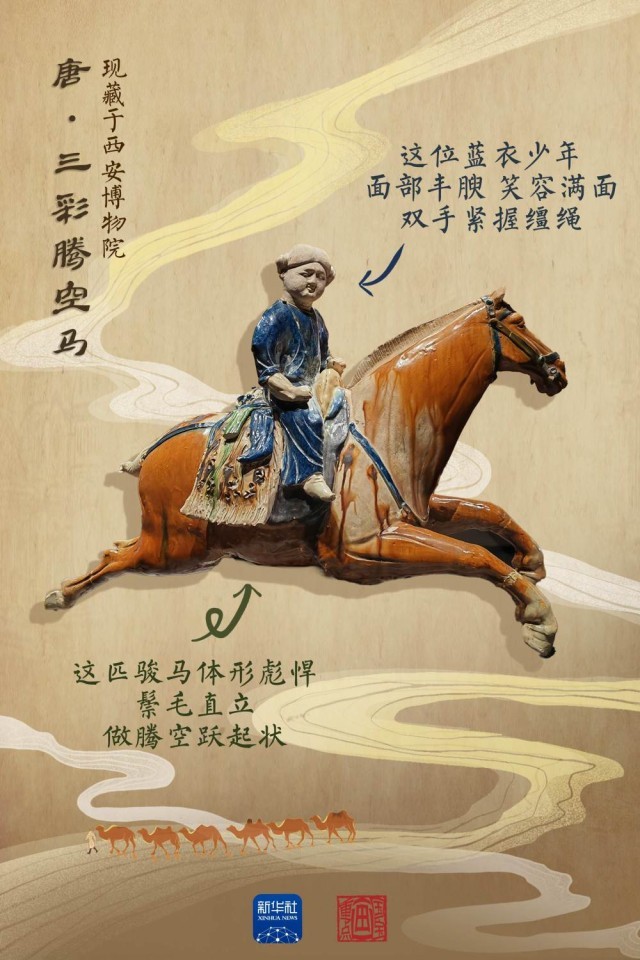 1000多年前,一位來自西域的“藍(lán)衣少年”,穿過茫茫戈壁、廣袤沙漠,抵達(dá)長安。這位“藍(lán)衣少年”,是西安博物院“明星”藏品——唐代三彩騰空馬之上的騎手?!八保惨娮C了這場跨越千年的文明交融。