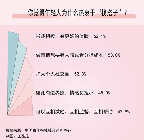 近日,中國(guó)青年報(bào)社社會(huì)調(diào)查中心聯(lián)合問(wèn)卷網(wǎng)(wenjuan.com),對(duì)1335名受訪者進(jìn)行的一項(xiàng)調(diào)查顯示,63.1%的受訪青年認(rèn)為找“搭子”是因?yàn)榕d趣相投,有更好的體驗(yàn),53.0%的青年覺得是因?yàn)樽鍪虑橄胍腥伺慊蛘叻謸?dān)成本。